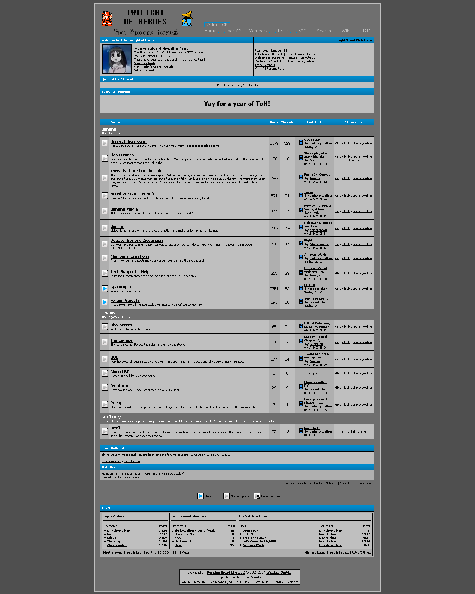 The forums were a category on the Twilight of Heroes forums, which I administrated at the time. As it happens, both the forums and this very website were originally hosted on linkskywalker.com. Tragically, I don't have many screenshots of those old forums. Here's the most representative one I could find for the period, though it looks like I the <Entelechy> category had not yet been added when this was taken.